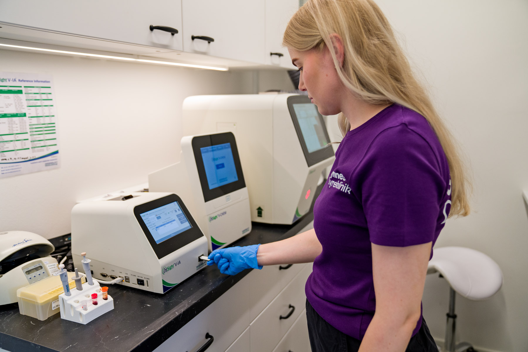 <p class="mb-4">Blodprøver giver vigtig information om dit dyrs sundhedstilstand og er essentielle for diagnose af mange sygdomme.</p><p class="mb-4"><strong>Vi kan måle:</strong><br/>- Blodtal (røde og hvide blodlegemer)<br/>- Lever- og nyreværdier<br/>- Elektrolytter<br/>- Blodsukker<br/>- Skjoldbruskkirtelfunktion<br/>- Bugspytkirtelfunktion</p><p class="mb-4"><strong>Andre laboratorieundersøgelser:</strong><br/>- Urinanalyse<br/>- Afføringsprøver for parasitter<br/>- Celleprøver fra knuder<br/>- Bakteriologi og resistensbestemmelse</p><p class="mb-4"><strong>Fordele ved blodprøver:</strong><br/>- Hurtige resultater (ofte samme dag)<br/>- Tidlig opdagelse af sygdom<br/>- Vigtig før bedøvelse og operation<br/>- Monitorering af kroniske sygdomme</p><p class="mb-4">Vi anbefaler årlige blodprøver til ældre dyr som en del af forebyggende sundhedspleje.</p>