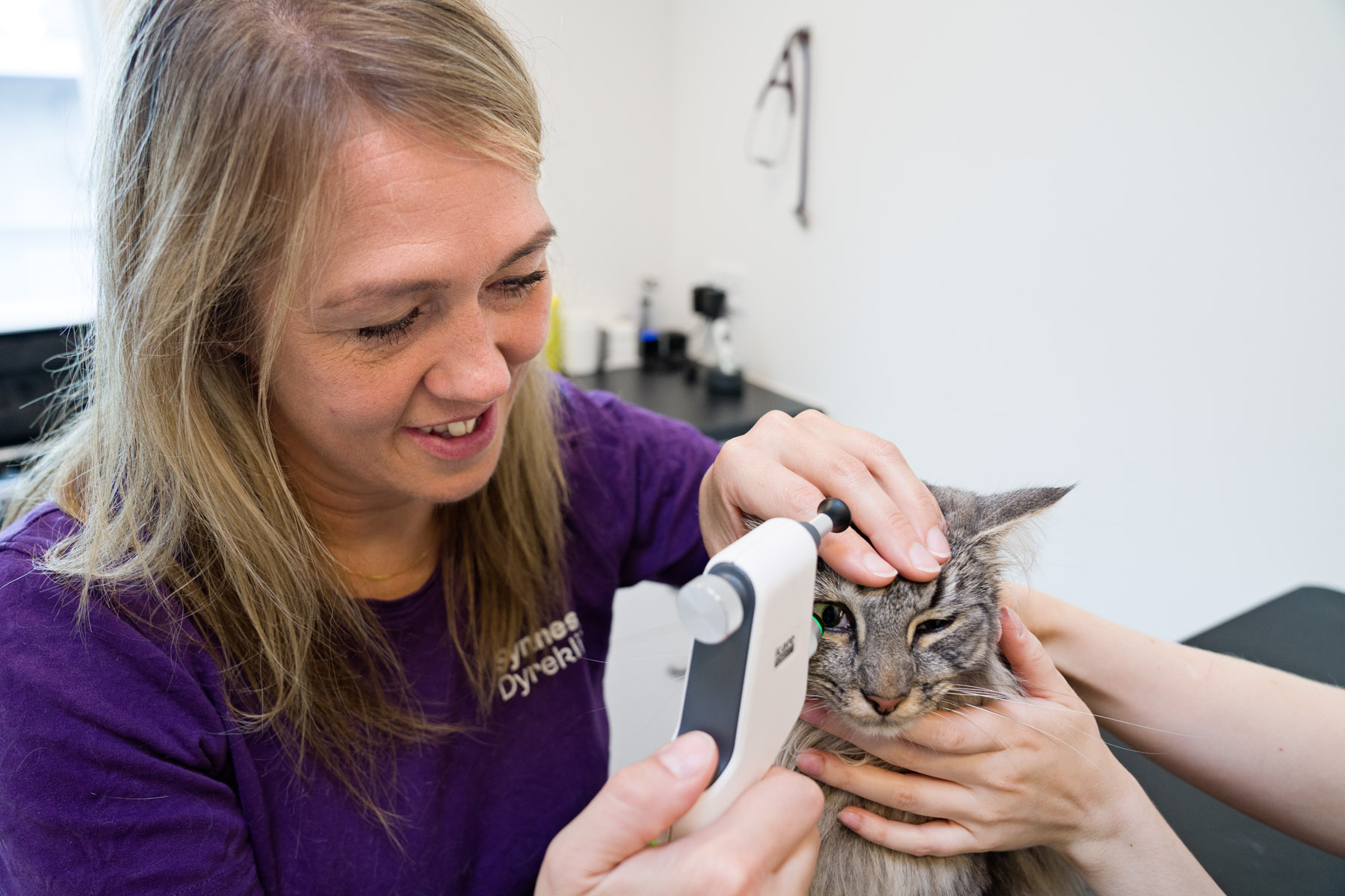 <p class="mb-4"><strong>Ethvert øje er akut indtil det modsatte er bevist</strong><br/>Derfor anbefaler vi altid at øjenlidelser bliver tilset samme dag.<br/>Vi råder over udstyr til at kunne vurdere de mest almindelige øjenlidelser.</p><p class="mb-4"><strong>Øjenkonsultation</strong><br/>En øjenundersøgelse kan indbefatte:<br/>- Vurdering af øjet og dets omgivelser<br/>- Måling af tåreproduktion<br/>- Måling af øjets indre tryk<br/>- Undersøgelse af pupilrefleks<br/>- Farvning for tjek af hornhindesår og tårekanalens passage</p><p class="mb-4"><strong>Henvisning</strong><br/>Vurderer vi at øjet kræver specialiseret behandling henviser gerne til vores dygtige øjenkyndige dyrlæger.</p>