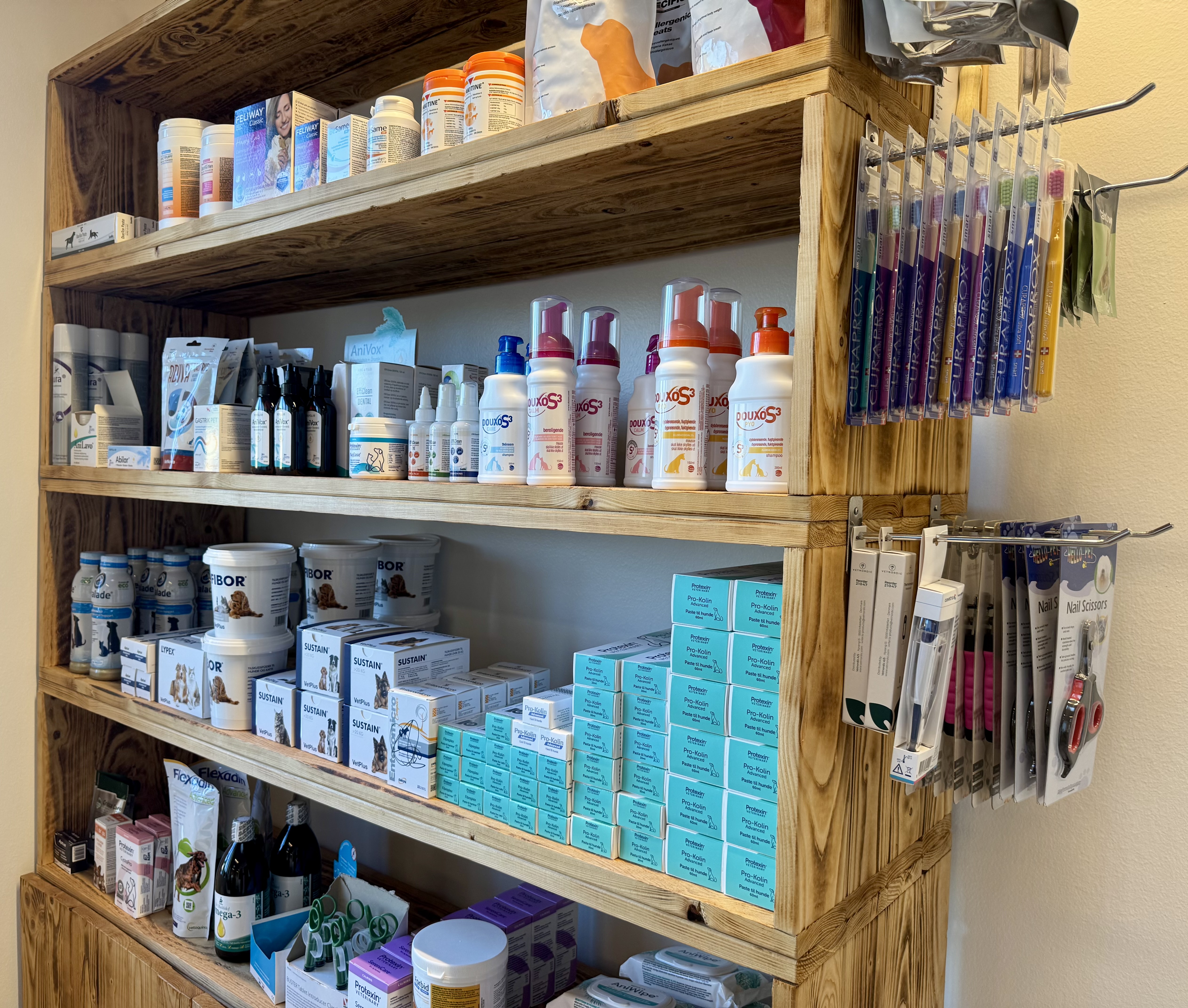 <p class="mb-4">Ud over konsultationer og behandlinger fører vi et udvalg af produkter til dit dyrs sundhed og velvære.</p><p class="mb-4"><strong>Parasitforebyggelse:</strong><br/>- Loppe- og flåtmidler<br/>- Ormekure<br/>- Øredråber</p><p class="mb-4"><strong>Plejeprodukter:</strong><br/>- Øjendråber og øjenrens<br/>- Ørerens<br/>- Shampoo og pelspleje<br/>- Tandbørster og tandpasta til dyr<br/>- Sårrens</p><p class="mb-4"><strong>Tilskud:</strong><br/>- Vitaminer<br/>- Ledsundhed <br/>- Probiotika<br/>- Omega-fedtsyrer</p><p class="mb-4">Vores personale kan rådgive om de rette produkter til netop dit dyr.</p>